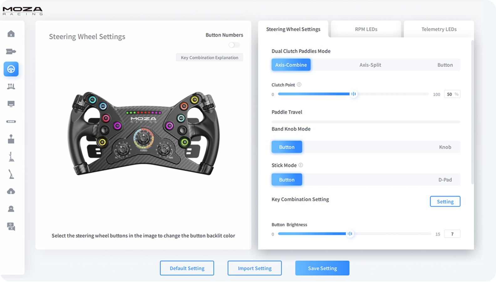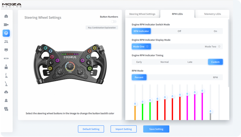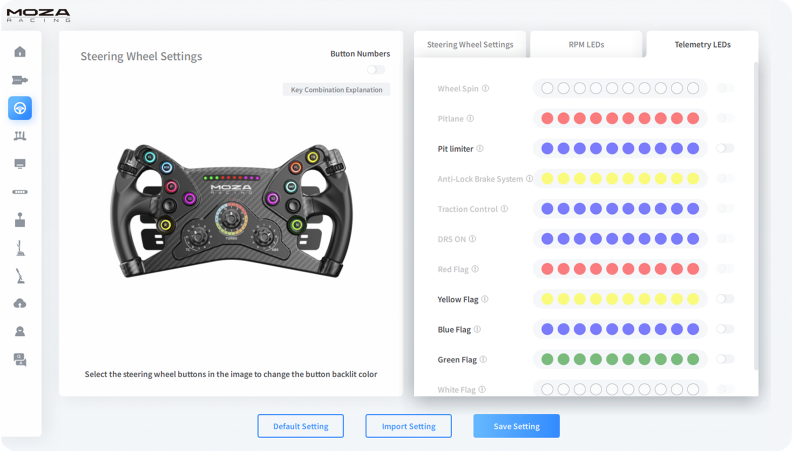 Configure double-clutch paddles, knobs, joysticks, RPM lights, and more.