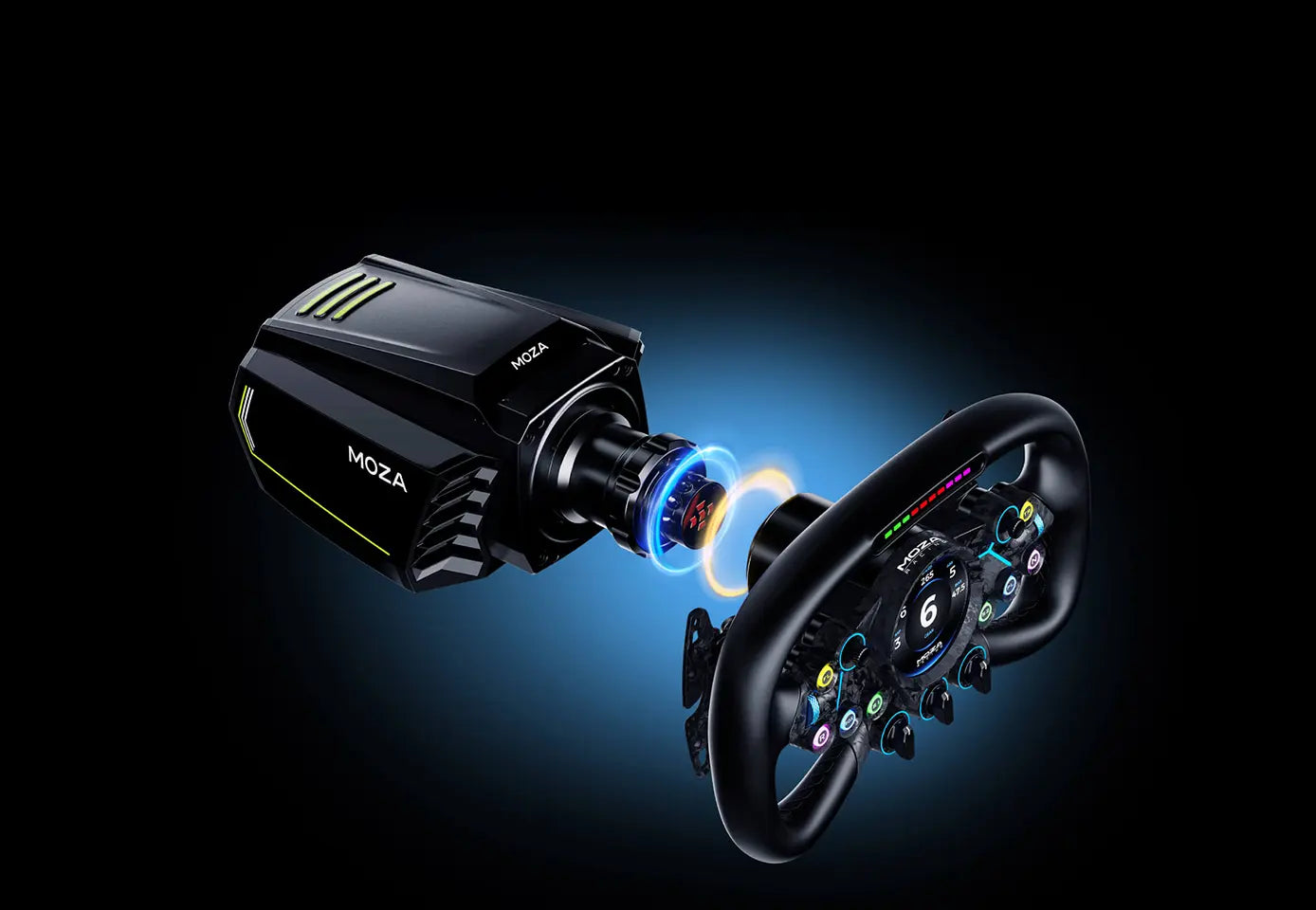 Experience unparalleled control and futuristic design with the MOZA Vision GS Wheel. Measuring 310mm, it features a 2.85-inch HD circular touch screen, a customizable UI, and a quad-core processor for real-time display rendering. Crafted from aerospace-grade aluminum and carbon fiber, it boasts a robust construction with hand-stitched microfiber leather grips. The wheel includes top-mounted RPM indicators, short-travel RGB buttons, and 72 programmable inputs. Compatible with all MOZA bases and third-party systems, it offers seamless connectivity through conductive slip rings. Elevate your racing with the MOZA Vision GS Wheel.